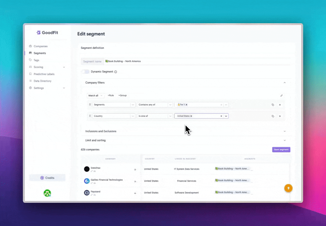 You can use any data point available in your GoodFit app to filter the accounts to be included in the segment. This includes calculated fields such as [Score](https://docs.goodfit.io/goodfit-docs/product/scoring-fields), [Tags](https://docs.goodfit.io/goodfit-docs/product/tags), or even other Segments.